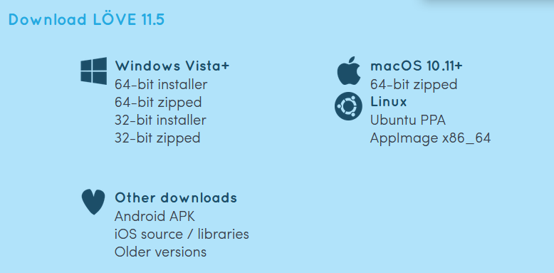 Hi there! LÖVE is an *awesome* framework you can use to make 2D games in Lua. It's free, open-source, and works on Windows, macOS, Linux, Android and iOS.